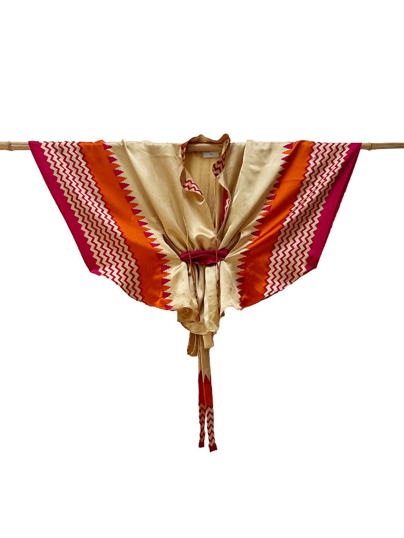 Each piece is unique. The sarees are gleaned during travels, then sewn by hand in Qatar by local artisans.