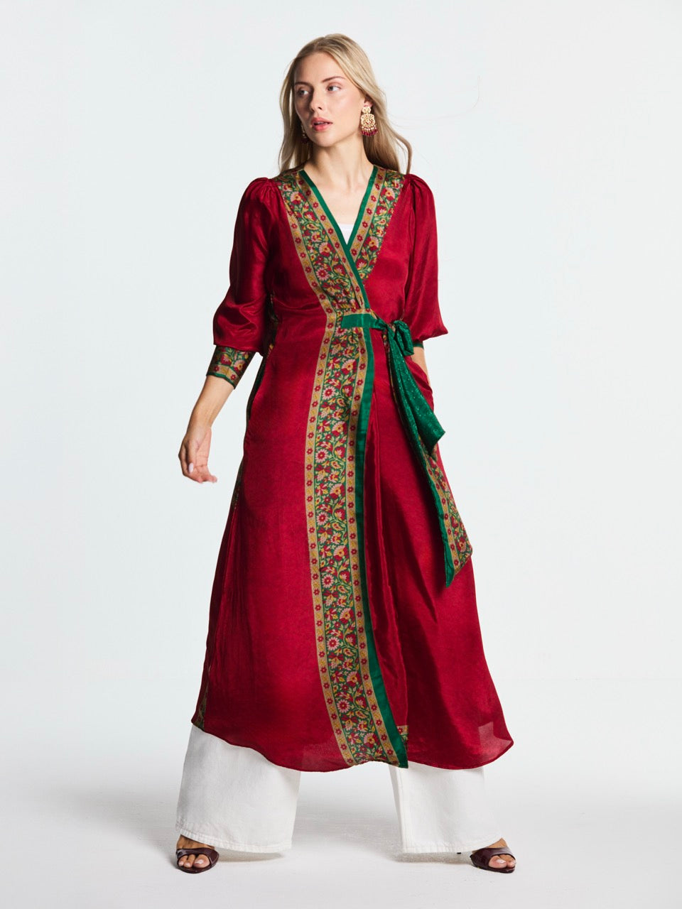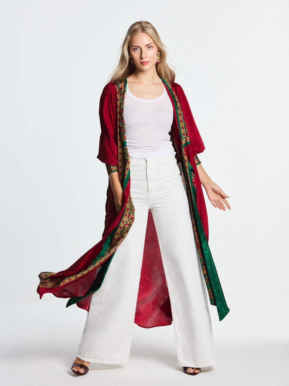 Each piece is unique. The sarees are gleaned during travels, then sewn by hand in Qatar by local artisans.