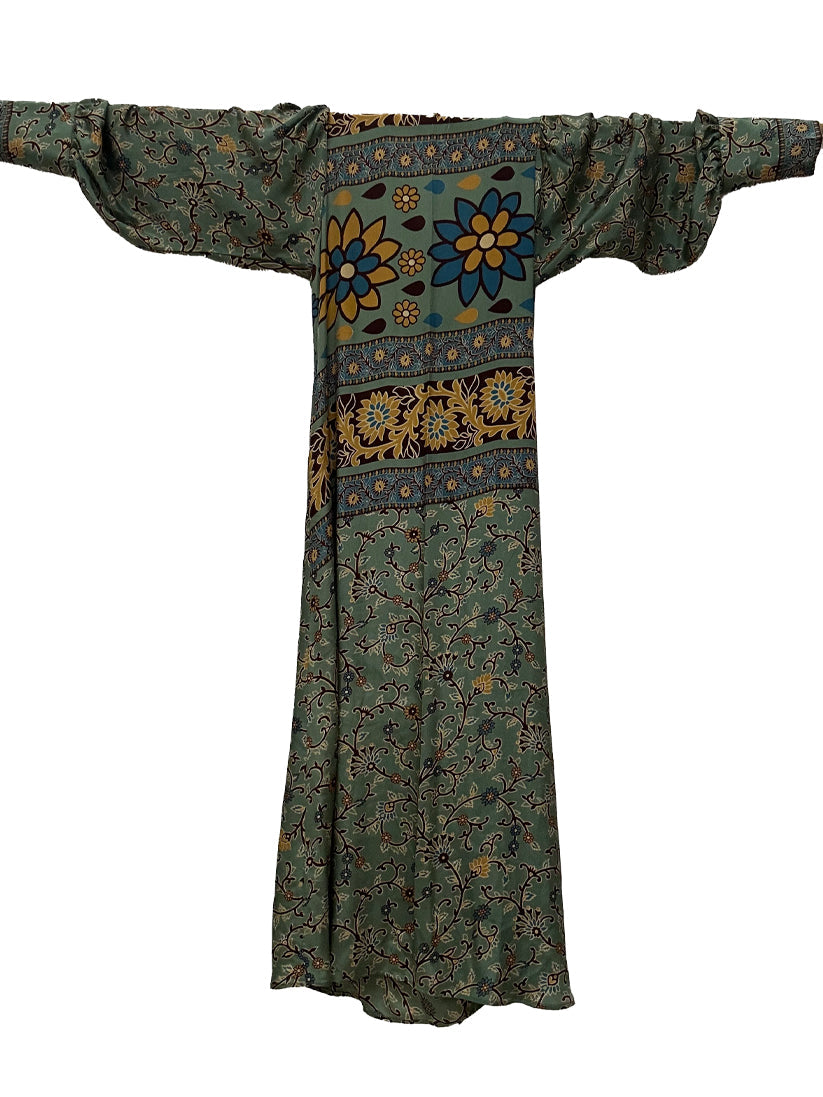 Each piece is unique. The sarees are gleaned during travels, then sewn by hand in Qatar by local artisans.