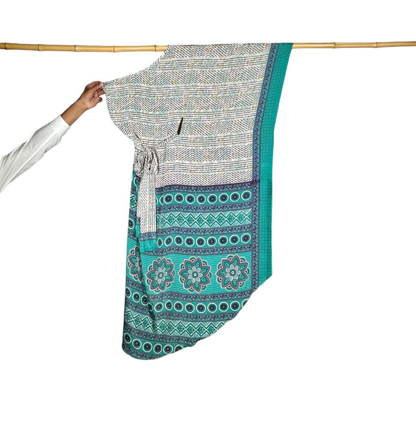 Each piece is unique. The sarees are gleaned during travels, then sewn by hand in Qatar by local artisans.
