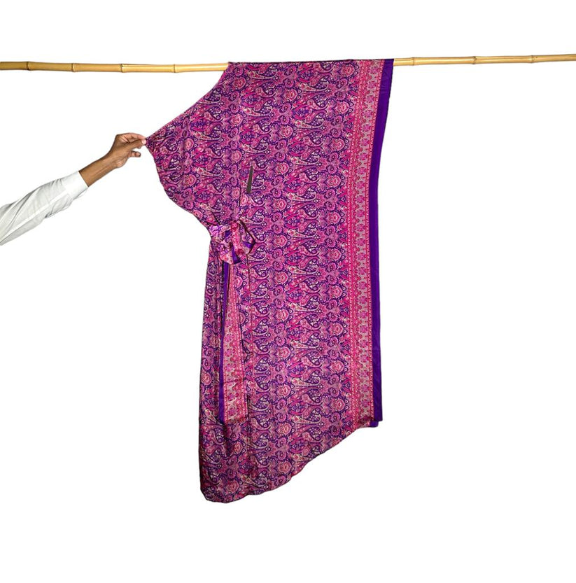 Each piece is unique. The sarees are gleaned during travels, then sewn by hand in Qatar by local artisans.