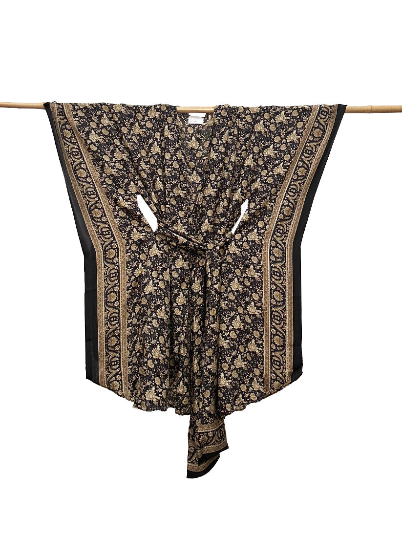 Each piece is unique. The sarees are gleaned during travels, then sewn by hand in Qatar by local artisans.
