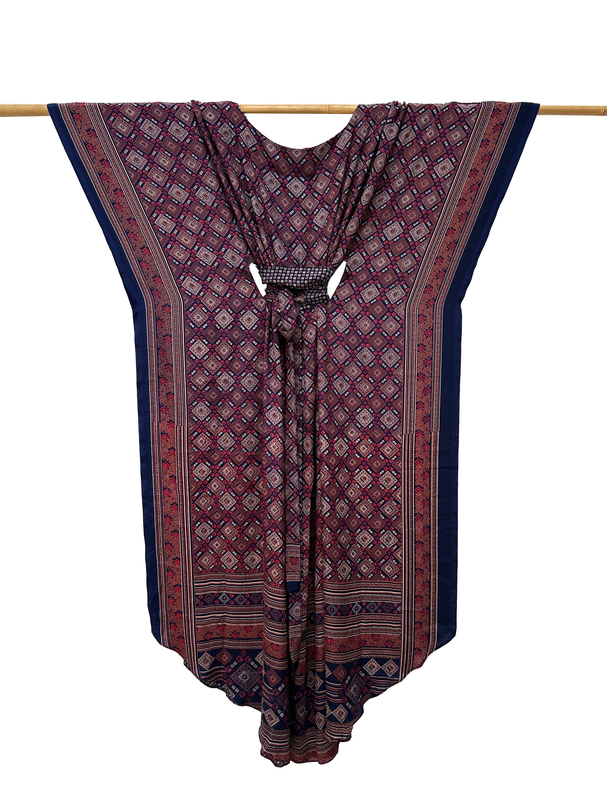 Each piece is unique. The sarees are gleaned during travels, then sewn by hand in Qatar by local artisans.