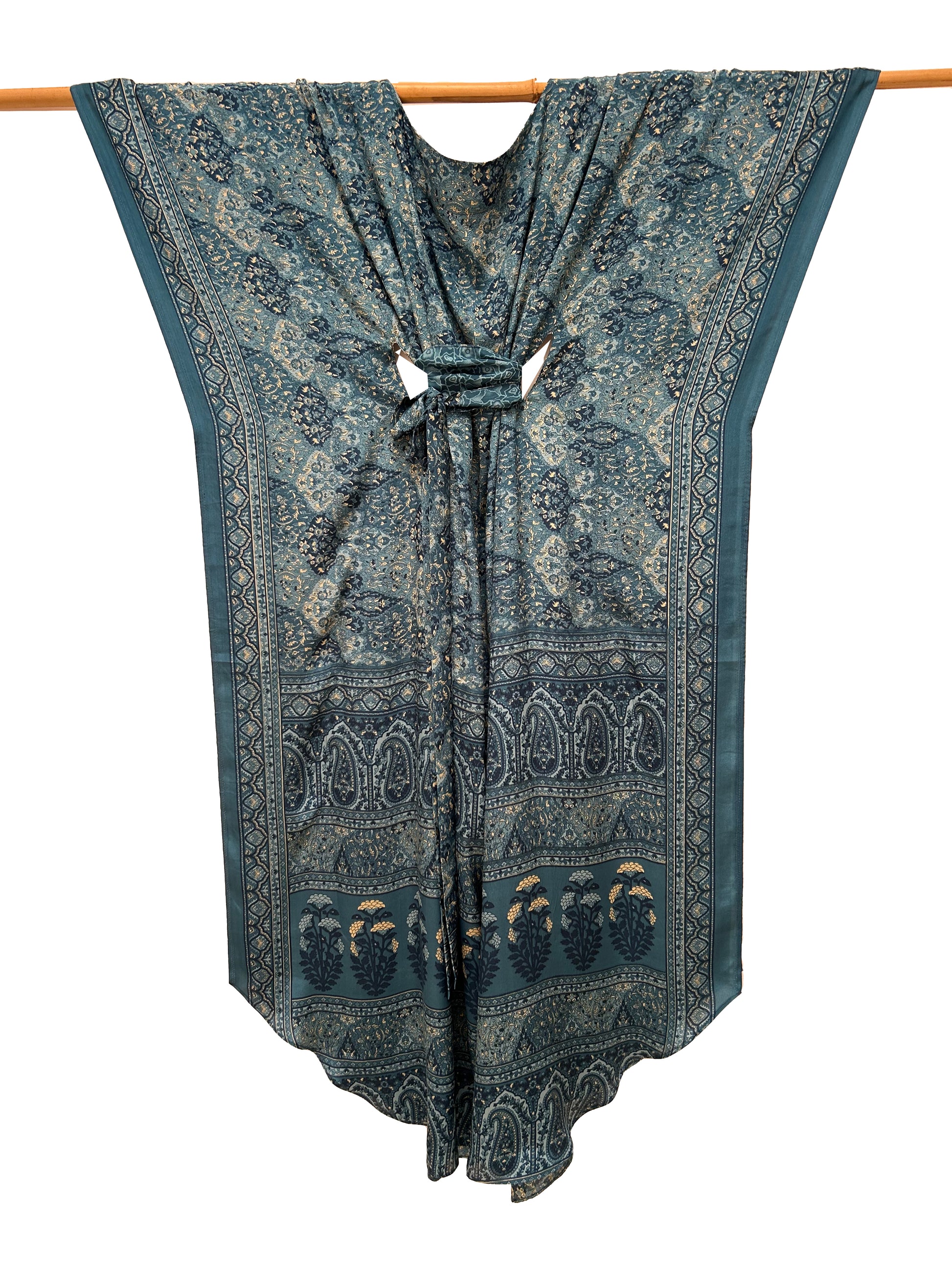 Each piece is unique. The sarees are gleaned during travels, then sewn by hand in Qatar by local artisans.