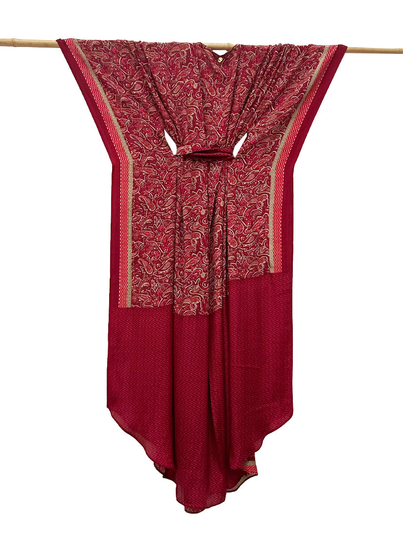 Each piece is unique. The sarees are gleaned during travels, then sewn by hand in Qatar by local artisans.