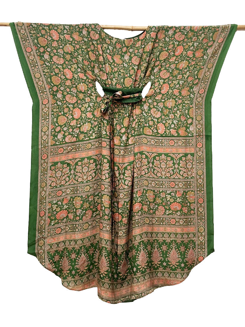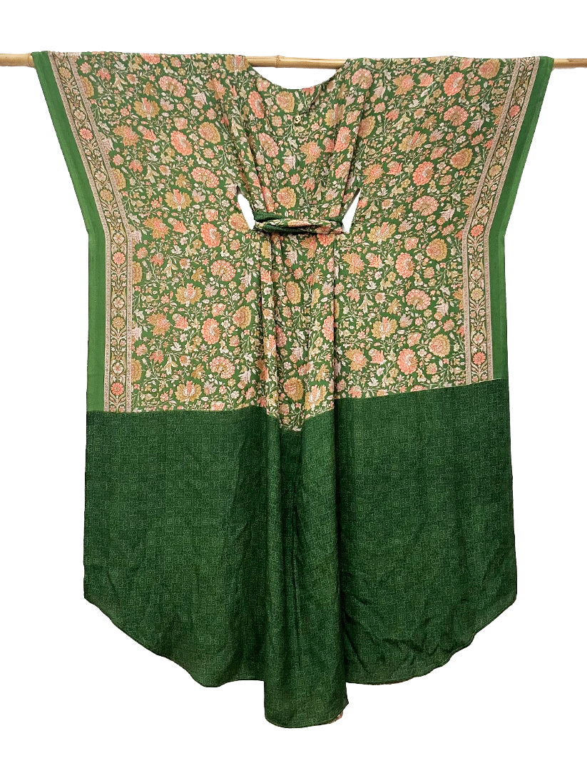 Each piece is unique. The sarees are gleaned during travels, then sewn by hand in Qatar by local artisans.