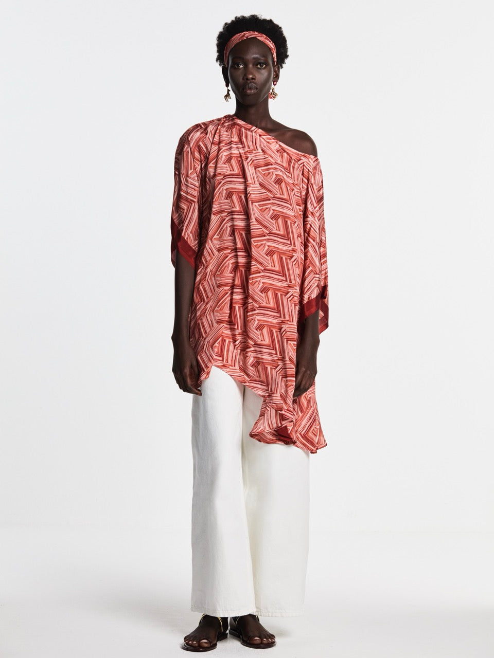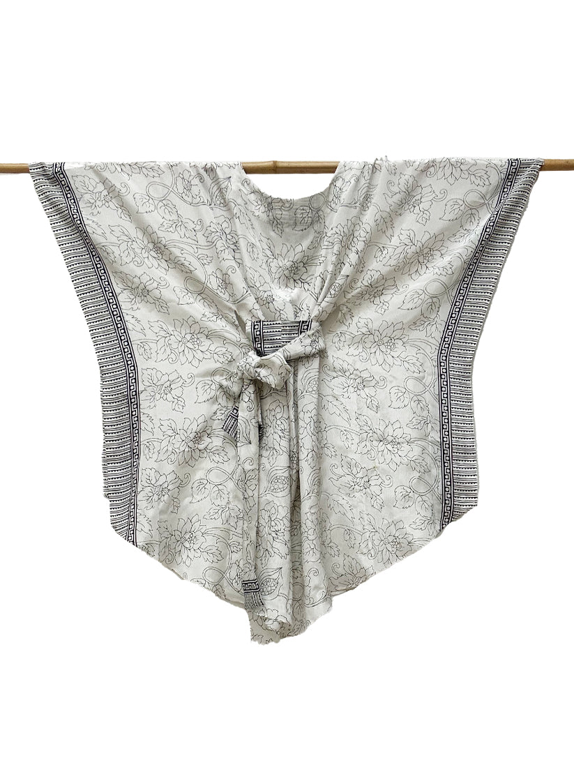 Each piece is unique. The sarees are gleaned during travels, then sewn by hand in Qatar by local artisans.