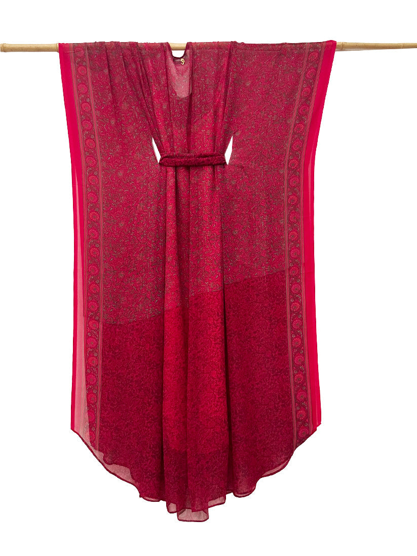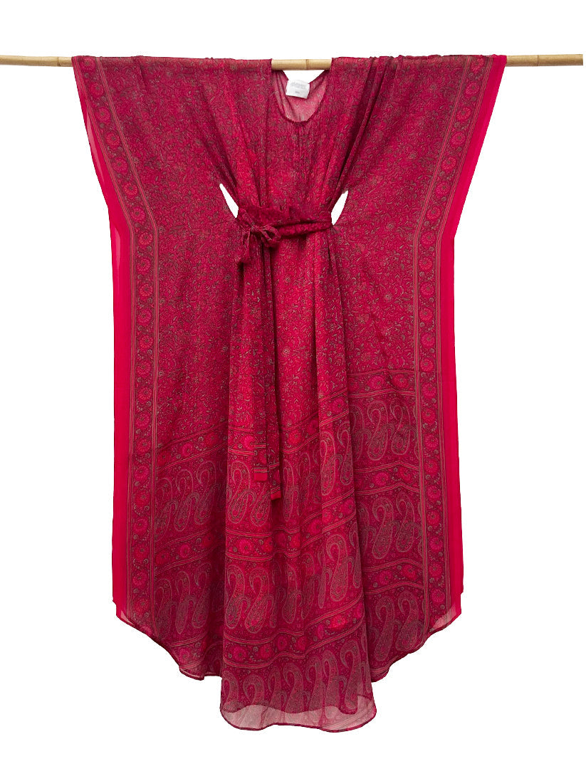 Each piece is unique. The sarees are gleaned during travels, then sewn by hand in Qatar by local artisans.
