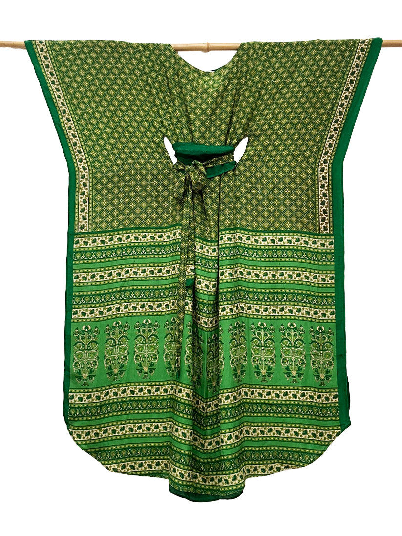 Each piece is unique. The sarees are gleaned during travels, then sewn by hand in Qatar by local artisans.