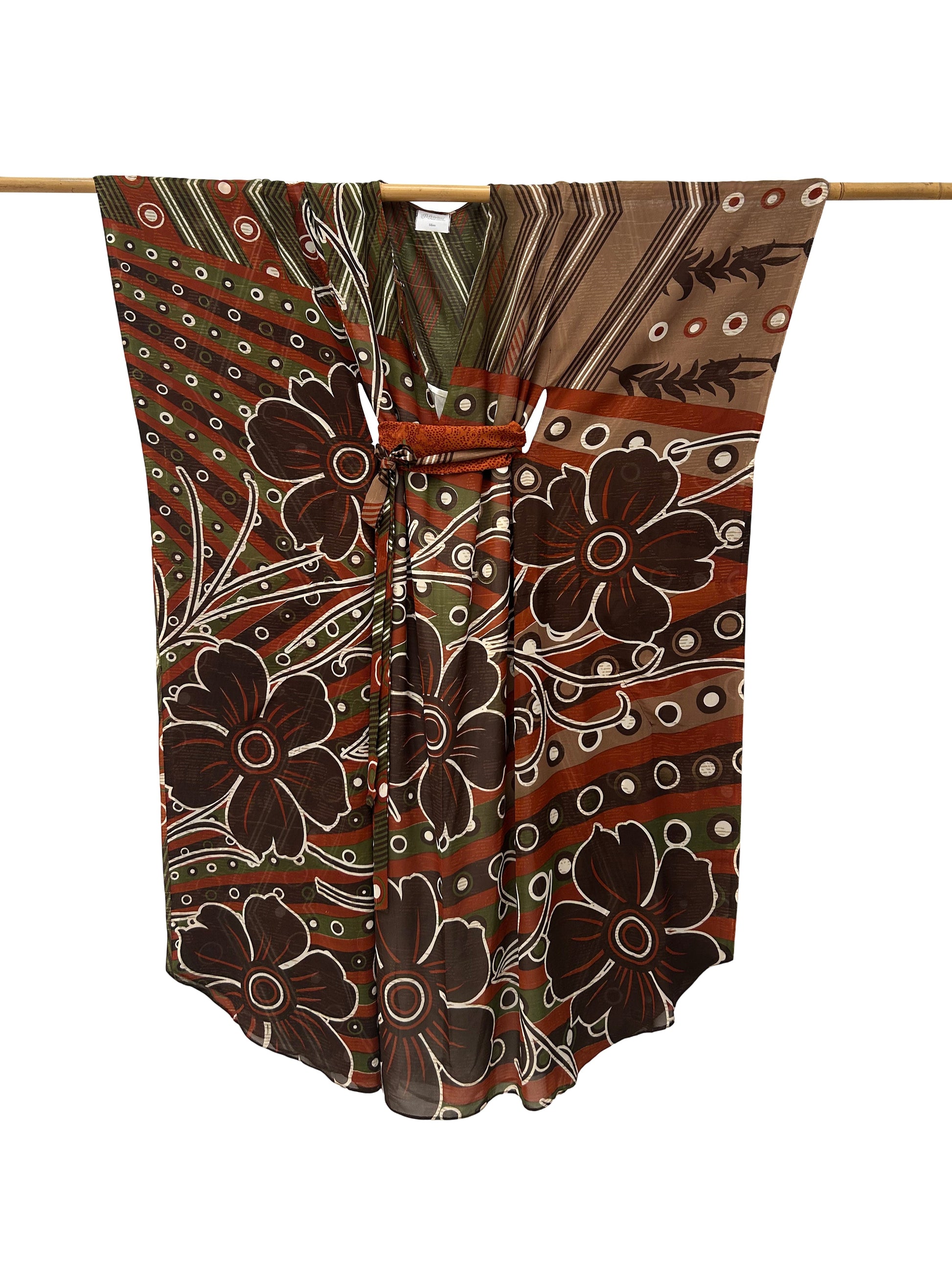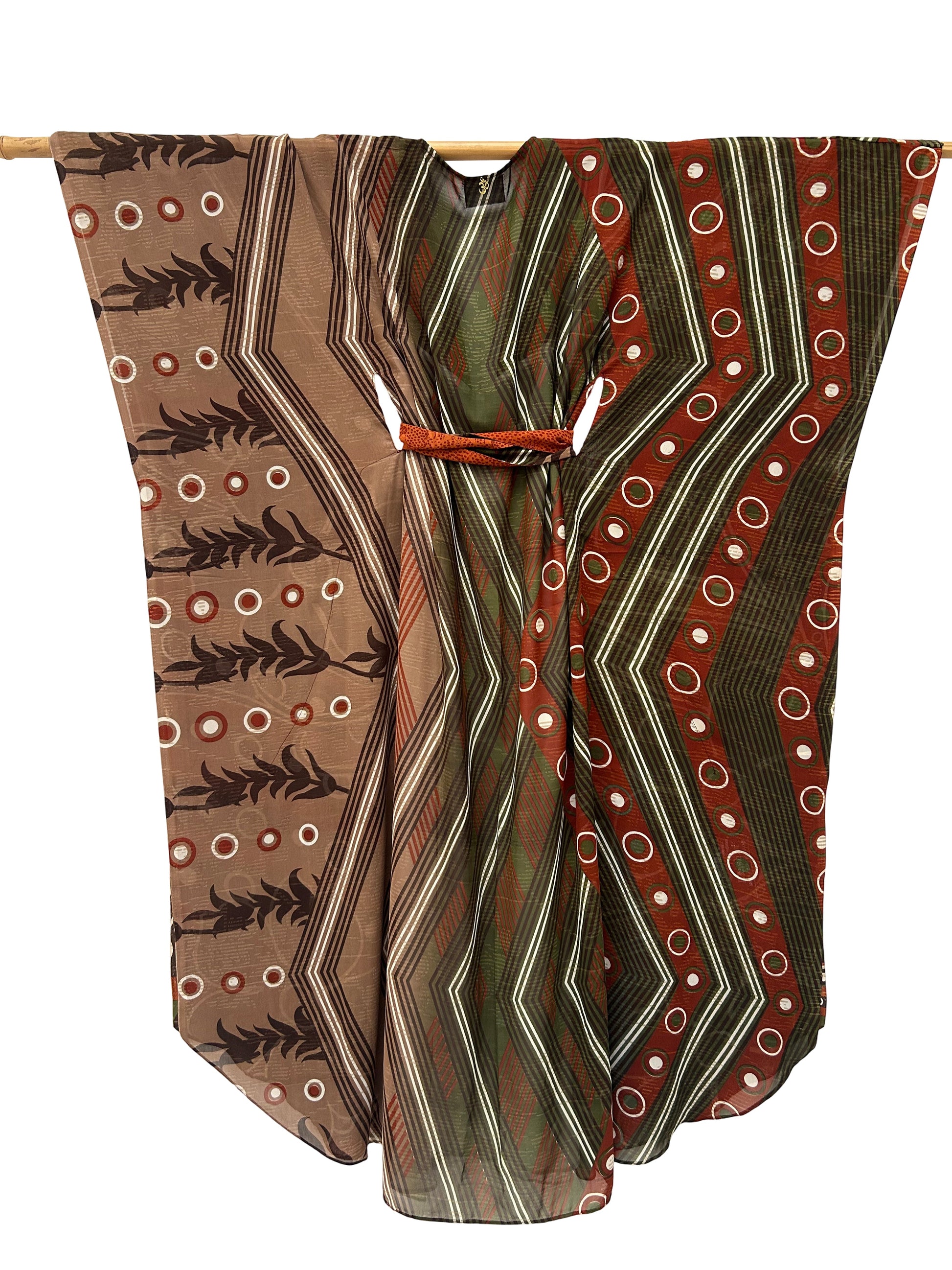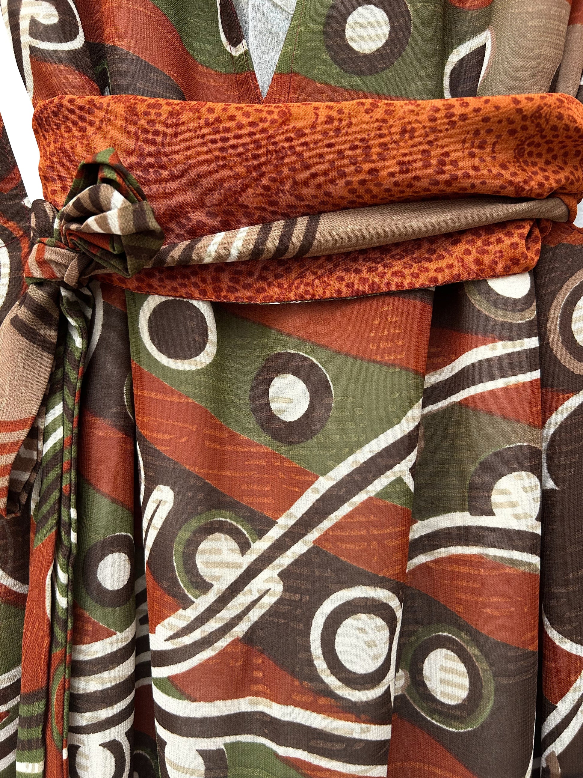 Romy is inspired by the Japanese Yukata with its wide belt, it goes down to the ankles and its collar opens with three small fasteners. Since it is in chiffon, it comes with a 100% silk slip dress.