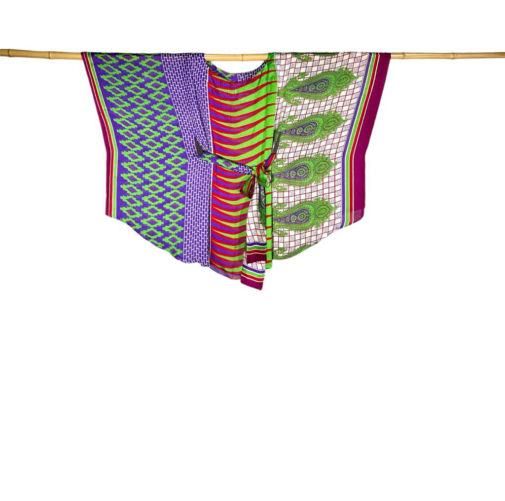 Each piece is unique. The sarees are gleaned during travels, then sewn by hand in Qatar by local artisans.